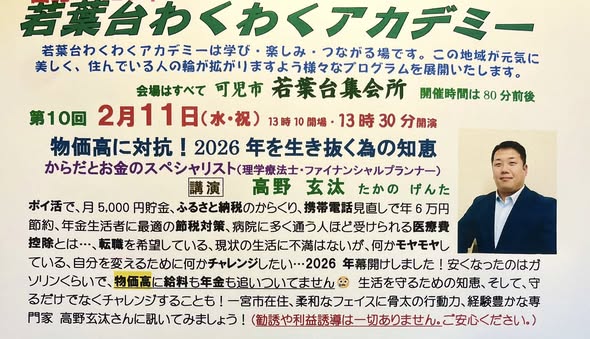 テーマは『物価高に対抗!2026年を生き抜く為の知恵』と題して、理学療法士でありファイナンシャルプランナーでもある高野玄汰氏が講演する。