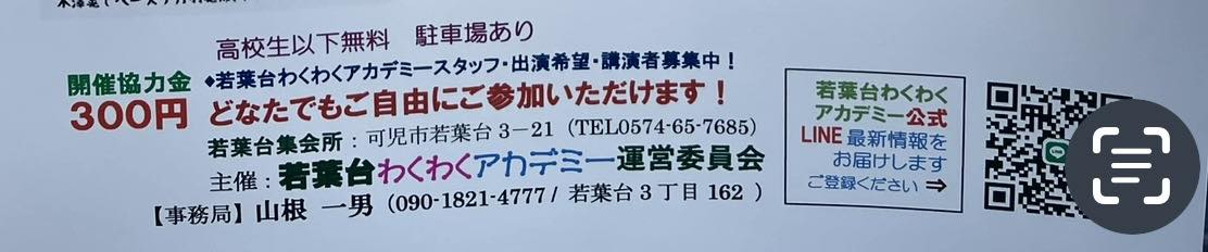明日2月11日(水・祝)13時30分より、第10回目となる若葉台わくわくアカデミーをキャンパスである若葉台集会所(可児市若葉台3−21)で開催する。